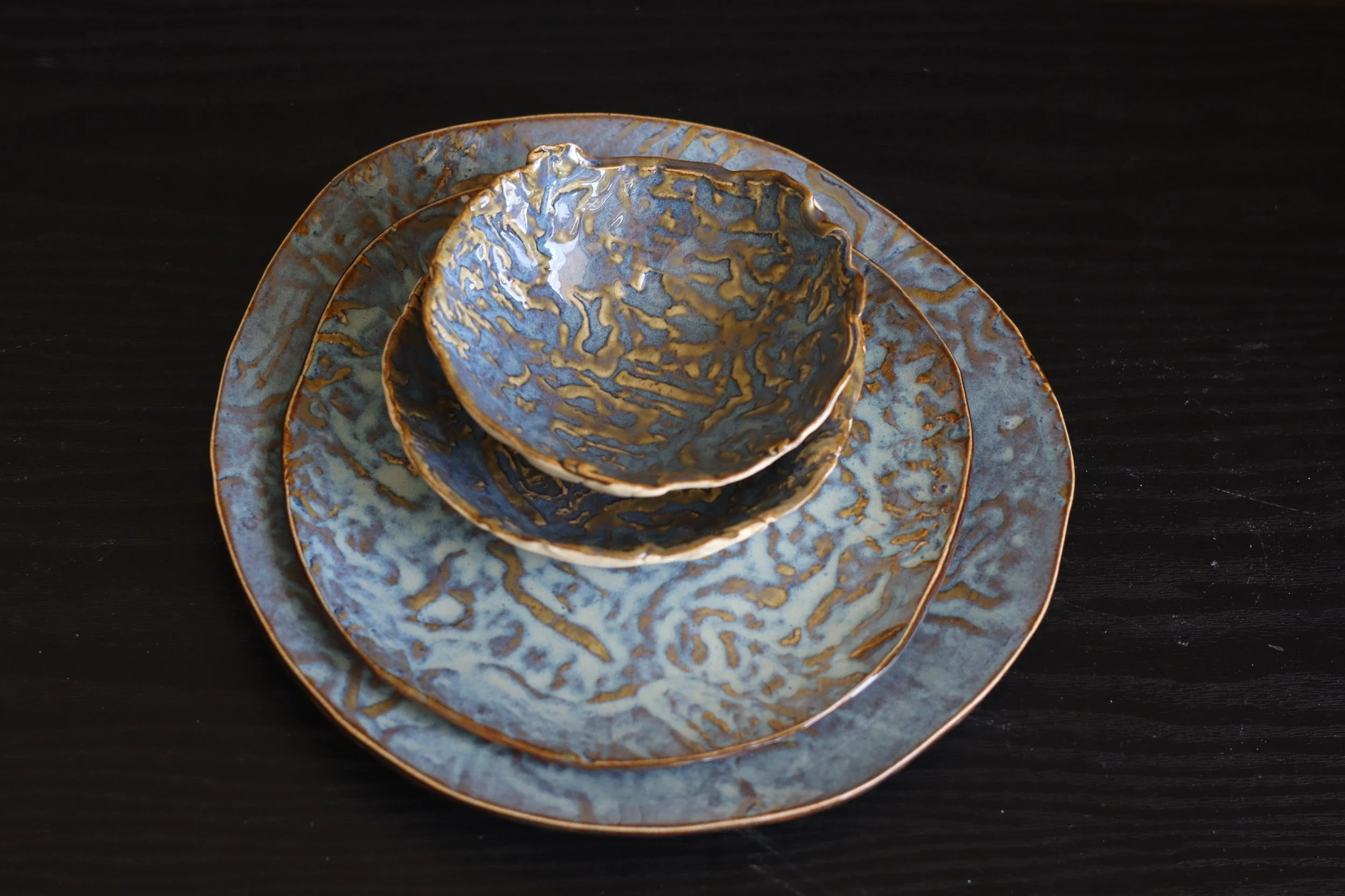 Buff Stoneware with a stunning Blue Rutile glaze that breaks brown over texture.